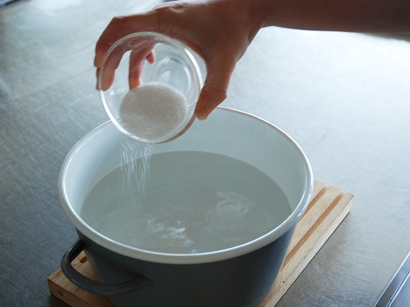 鍋に1.5Lの水を張り、そこに大さじ2杯の重曹を入れます。