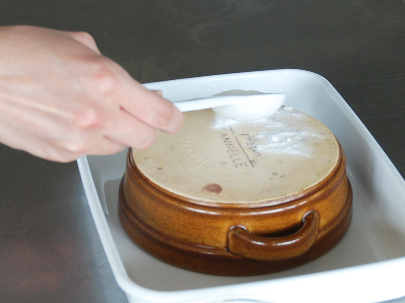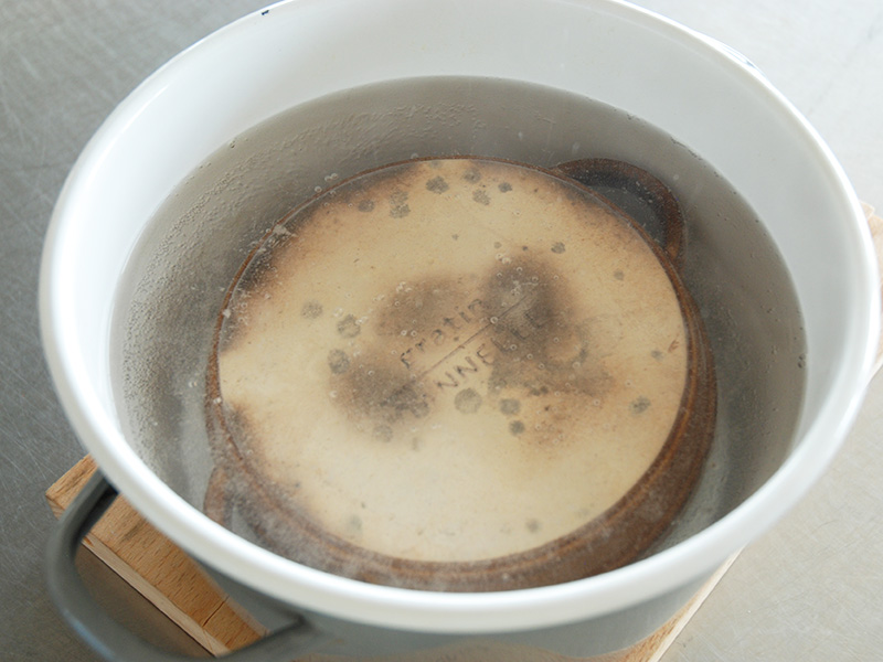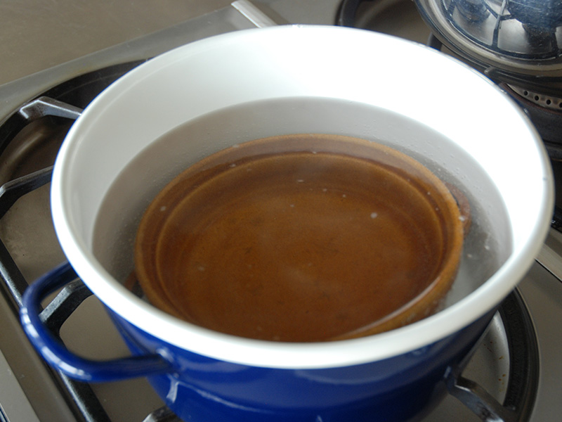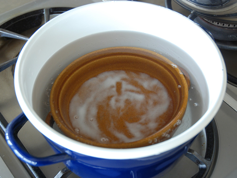 弱火で加熱をしていくと重曹がだんだん溶けてきます。 沸騰したら、器を入れて約1時間放置します。