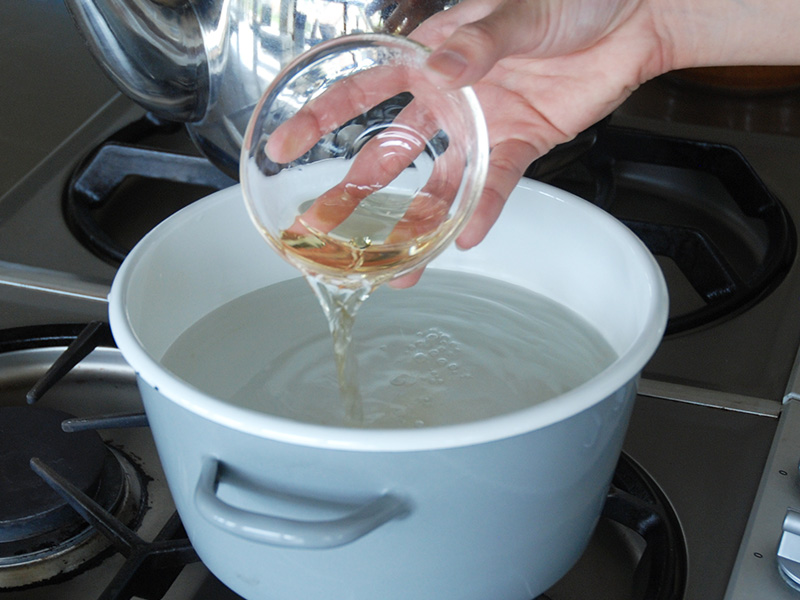 鍋に1.5Lの水を張り、そこに大さじ3杯の酢を入れます。