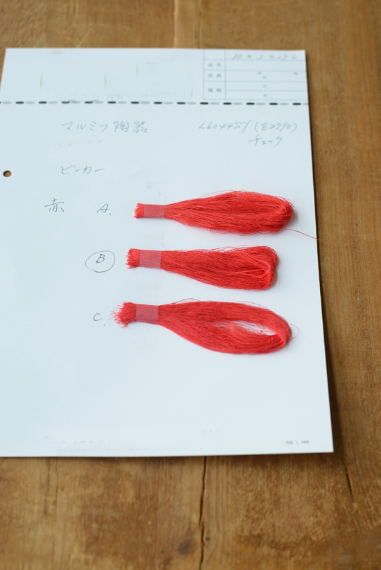 染め糸は写真で色の濃淡がわかりづらいですが、淡すぎず、赤色に寄っていない中間の色味を選びました。