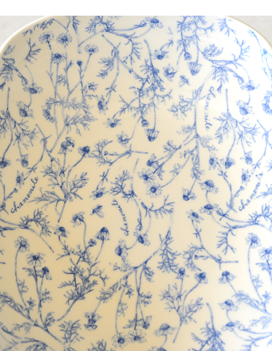 青を基調とした草花や動物などの図柄が全面に描かれている器を眺めるのが