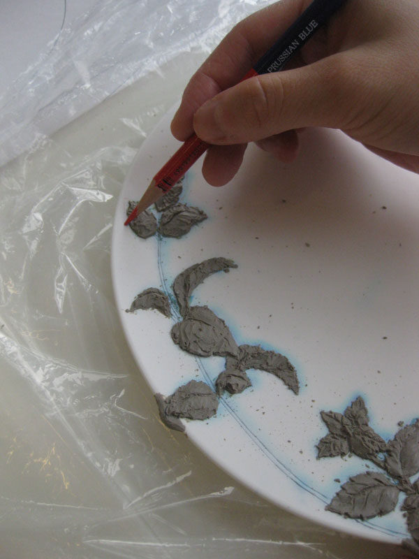 透明感のある釉薬によってミントの繊細な彫刻が美しく見えるのがポイントです。