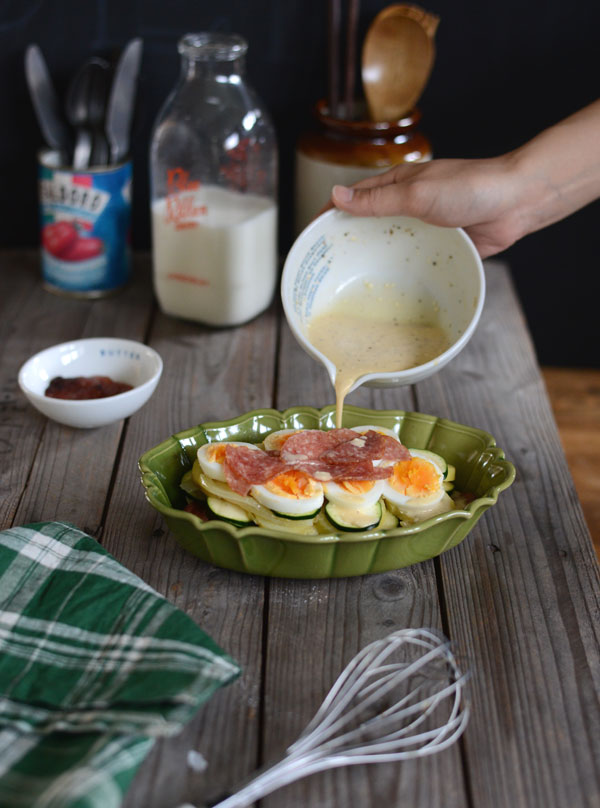 じゃがいも、ゆで卵、ソーセージ、好きな具材にサワークリームを重ねて