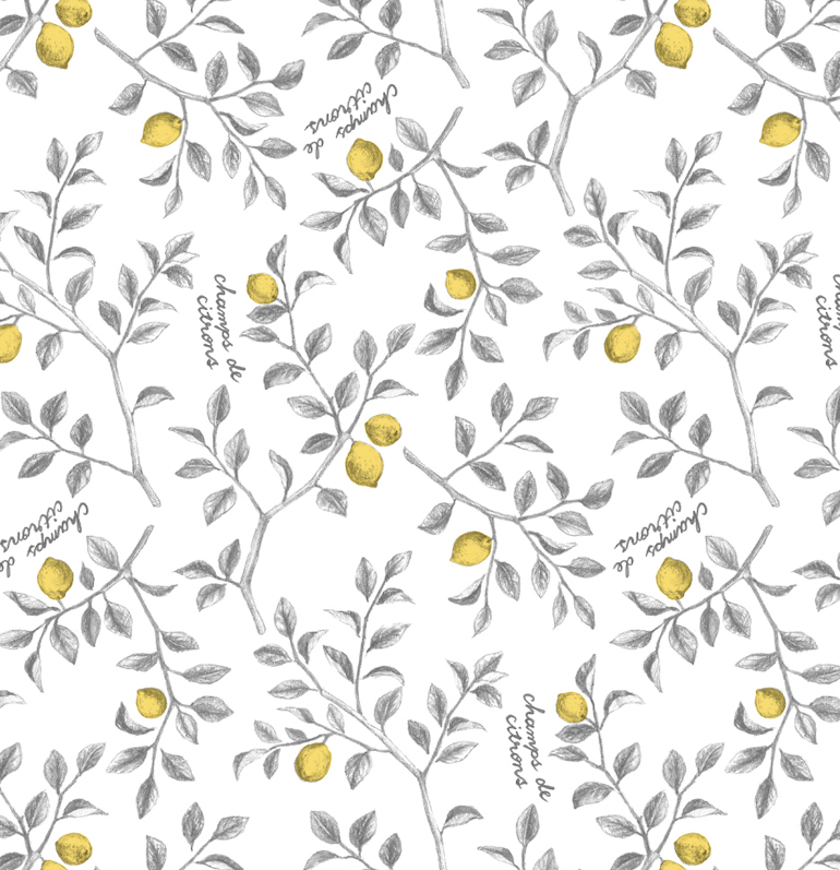 レモンがたわわに実る畑を想像しながら描いたシトロンの模様。