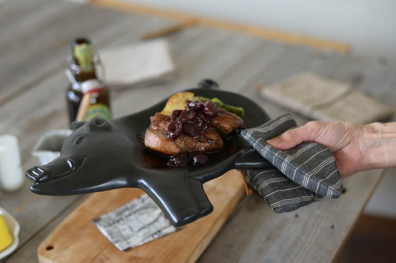 ポークグリラーで調理した肉料理をそのまま食卓に運んで熱々をいただく。