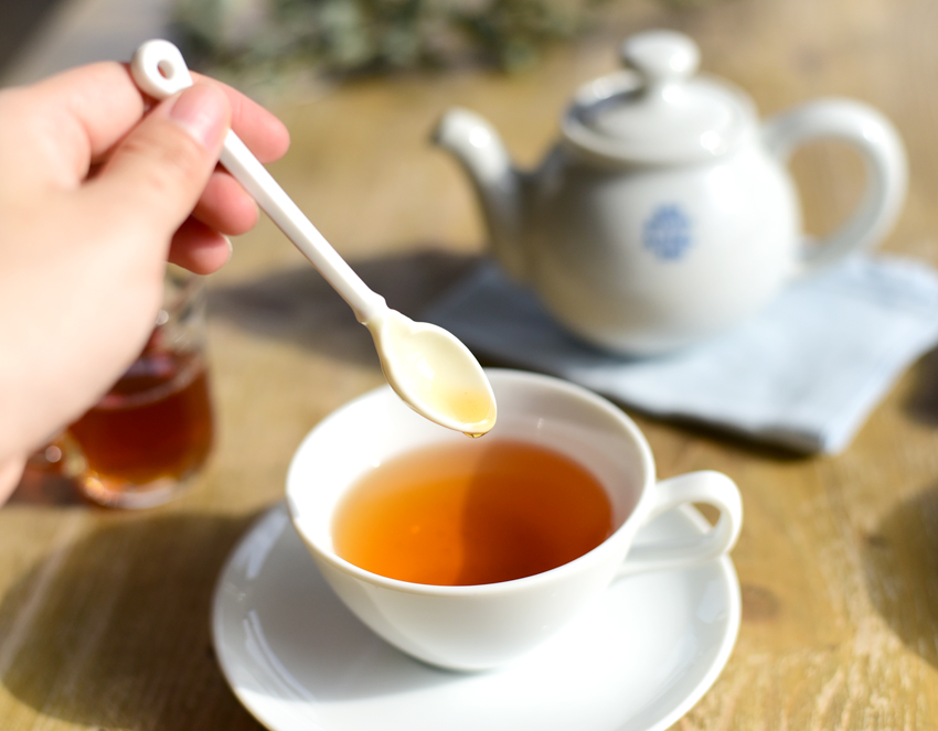 カップソーサーに添えて、はちみつや砂糖を混ぜたり、