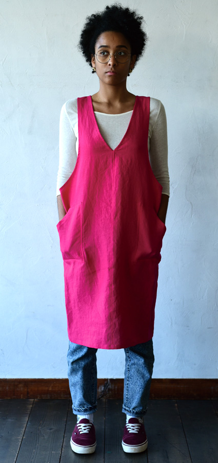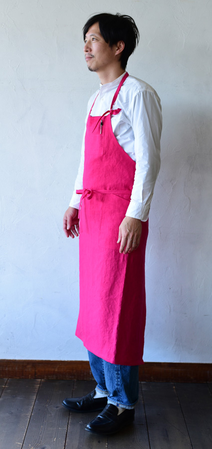 Vネックプルオーバーエプロンは脱ぎ着がスムーズで着崩れしないのでワンピース感覚で身につけることができます。