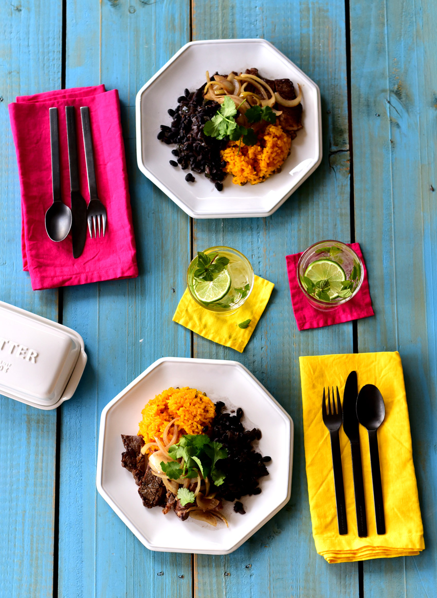 ステーキとごはんに黒インゲン豆を煮込んでかけたワンプレートのテーブルに、