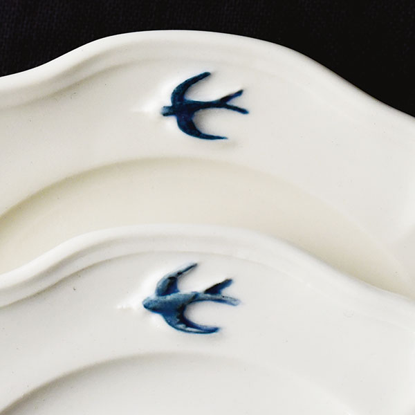 器はデザインにより様々な成型方法で生産されています。土を器の形にする際に、方法によって様々な特徴が現れます。 土を伸ばして形作る際に表面にシワが生じたり、土を型に流し込む際に、土の跡が波紋のように表面に表れる場合があります。 また、型と型の接着部分に生じる線や泥を捨てる際に生じる泥の跡や筋なども成型方法による特徴です。