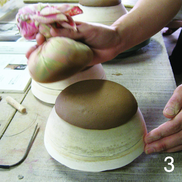 石膏型などに押し付けて成型します。(道具を使わず手だけで行うこともあります。)