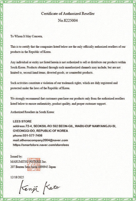 With the copy products dispersing on the market, we have created official MARUMITSU POTERIE logos to protect our customers from such frauds. Shops with these logos are our authorized dealers of MARUMITSU POTERIE. Shop owners who wish to use our official logos, please contact us at following address; export@marumitsu.shop We will check the qualifications and contact you. ※MARUMITSU logos are to be used by authorized BUYER only. Logos are valid for 1year and will be renewed every year. BUYER must update the logos upon renewal.