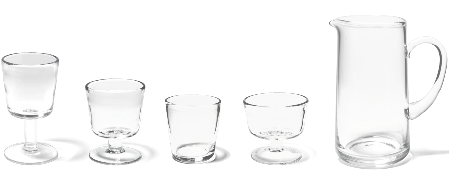 (左から)ワイン、ゴブレット、タンブラー(S)、デザート、ピッチャーと、日々の暮らしに寄り添うアイテムをご用意。飲みものはもちろん、冷たいスイーツや前菜を盛り付けても絵になり、食卓に涼を届けてくれます。