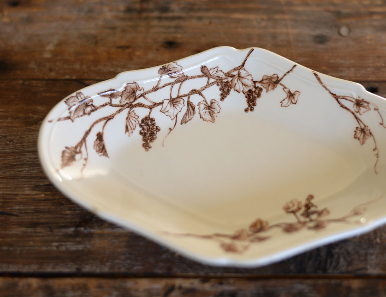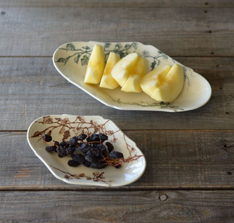 料理と絵柄がより引き立てあうように、葡萄の枝や果実、伸びた蔓を大胆に配置しました。