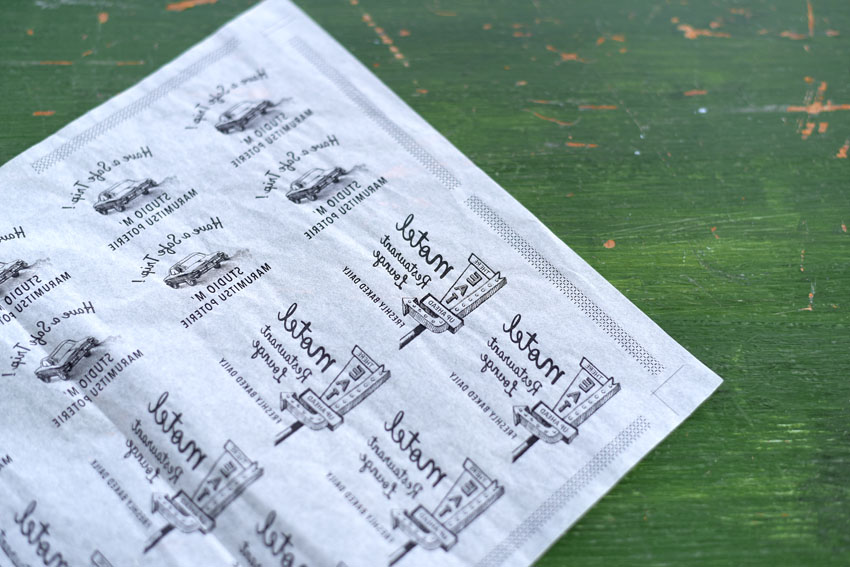 和紙に印刷された図柄の顔料を器に貼って写す銅板転写という技法を使っています。
