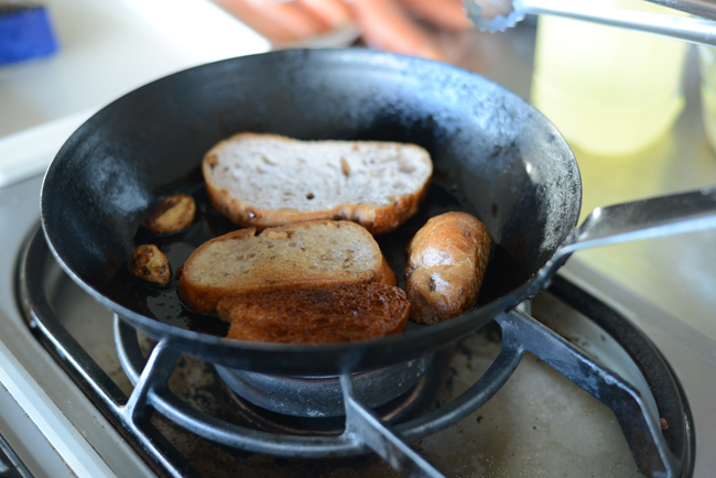 クルトンはガーリックオイルで香りをつけながらカリッとフライパンで焼いておく。