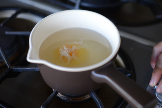 お酢を加えたお湯でポーチドエッグを作る。