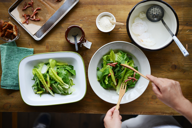 今日はシーザーサラダに欠かせないロメインレタスをベースに、柔らかい春の七草を合わせる。
