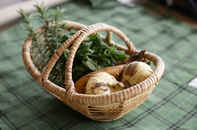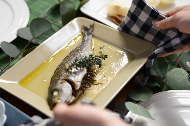 焼き上がったらそのままテーブルに。ハーブの香りも効いていておいしそう。