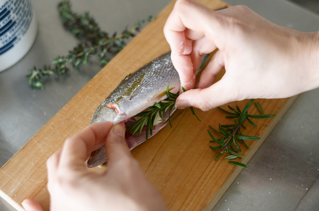 メインのイサキのお腹にローズマリーとタイム、潰したにんにくを詰めて。