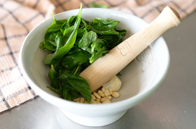 新鮮なバジルに松の実、にんにく、オリーブオイルをすり鉢で潰してペーストにする。