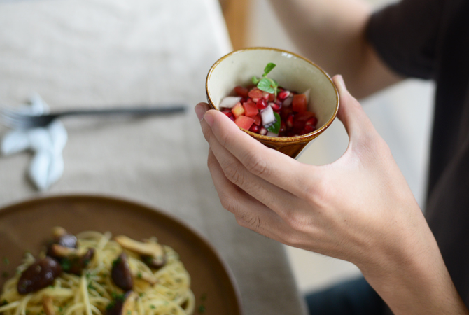 パスタとサラダだけの簡単な料理でも、旬の風味のいい食材を使えば十分ごちそうになる。