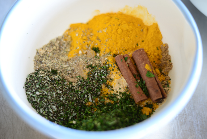 玉ねぎ、トマトと数種類のスパイスやハーブからカレーの素を手作りする。