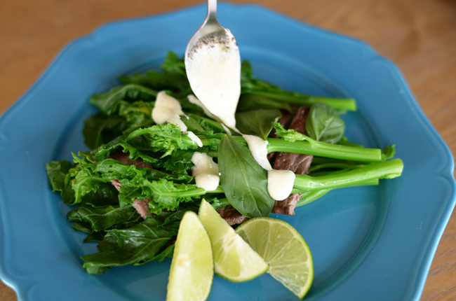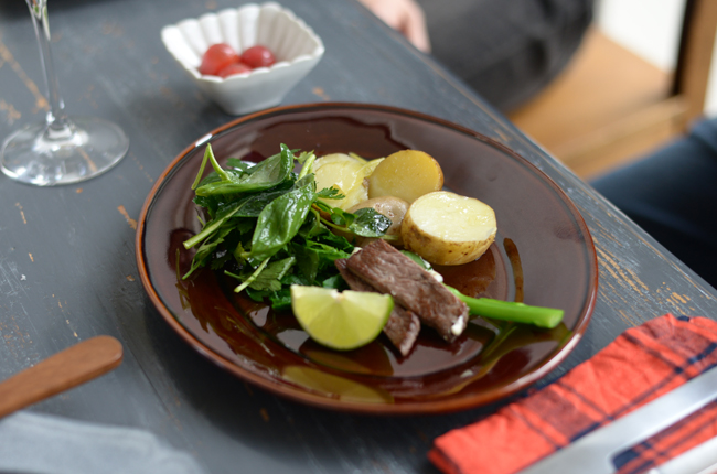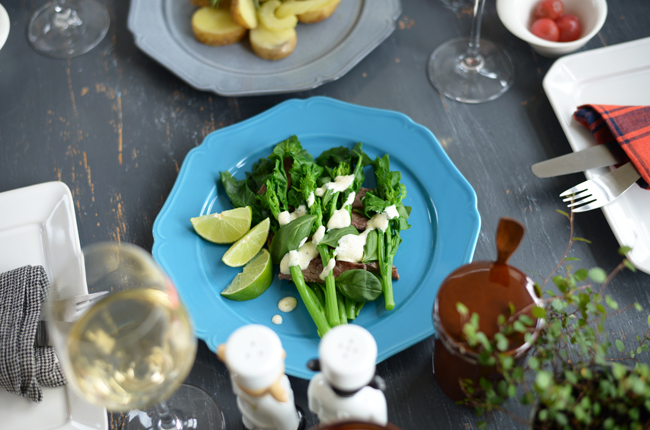 ステーキを旬の菜の花と合わせてサラダ仕立てに。バジルとライムの爽やかさを加えて味わう。