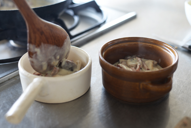 きのこを炒めたフライパンひとつで、ベシャメルソースまで手軽にできるのがうれしい。