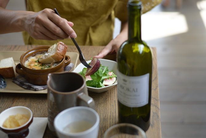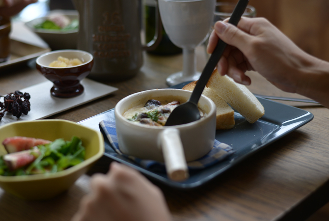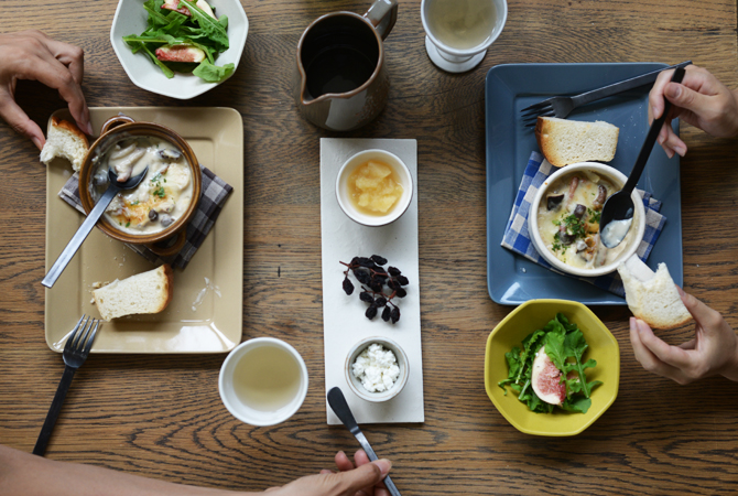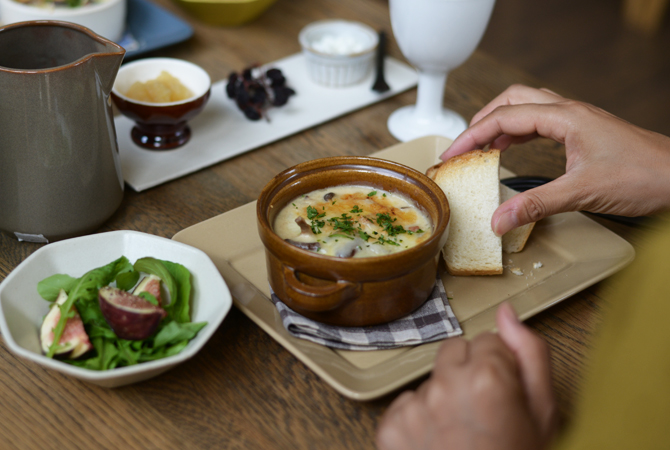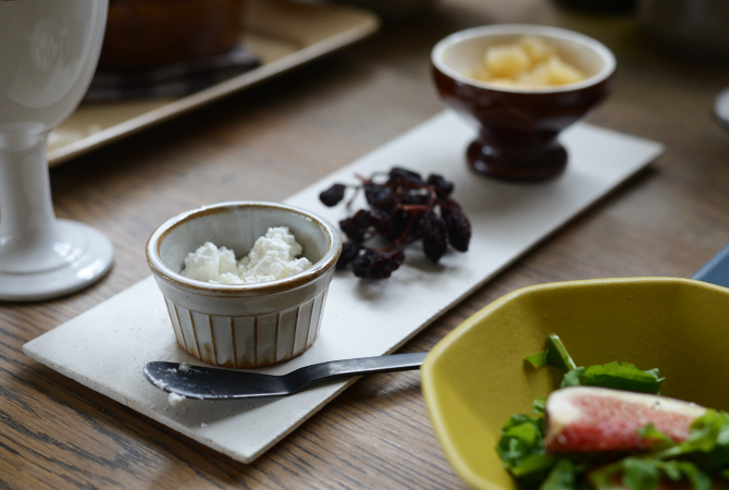 トレーみたいな薄い陶器のプレートにはパンと楽しみたいチーズやジャムなどを並べて。