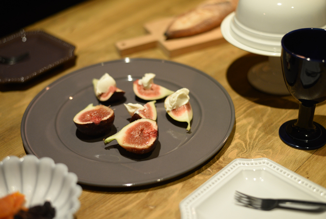 グレイッシュピンクのプレートにはいちじくとクリームチーズのアミューズを。