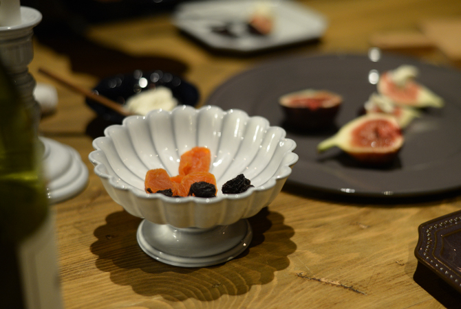 大人っぽいモーヴ色で、ワインのおつまみをのせるのにちょうどいい。