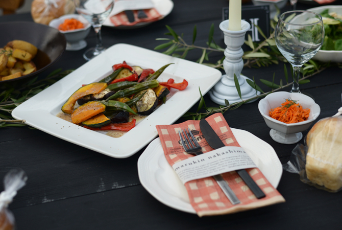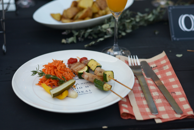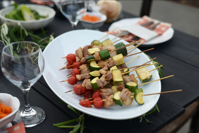 ズッキーニとミニトマト、スパイシーな豚肉の串焼きをまとめて大皿に盛りつける。