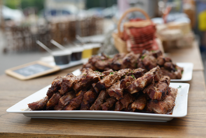 甘辛いスペアリブをミントを効かせた爽やかなヨーグルトソースをつけて食べる。