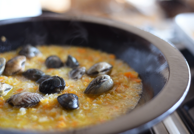 あさりの口が開いたら一旦取り出しておき、メバルとミニトマト、オリーブを入れて火にかける。