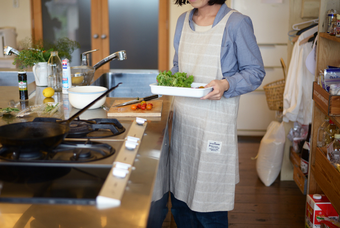 スモックみたいなリネンのエプロン。