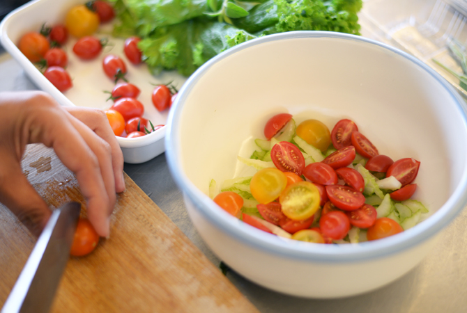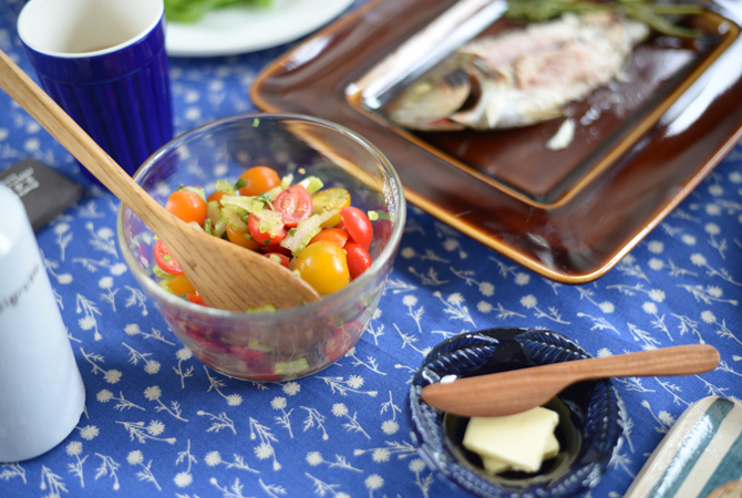 付け合わせに、瑞々しいミニトマトとセロリを合わせてシンプルなサラダを作る。
