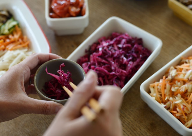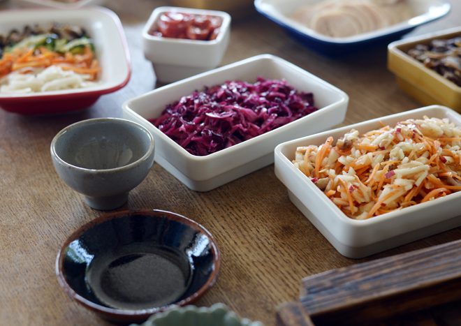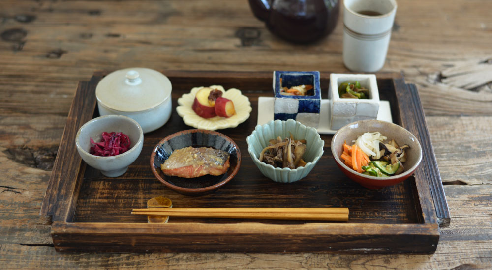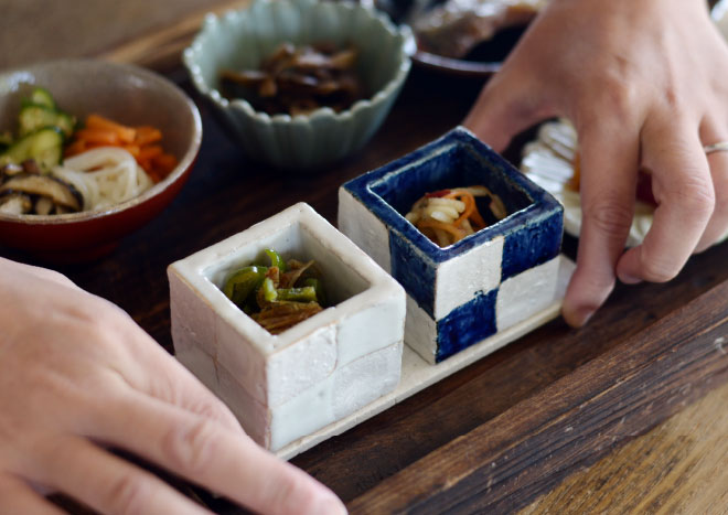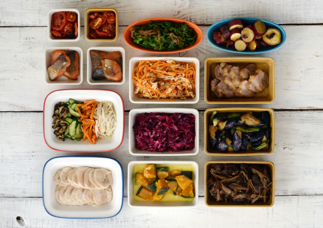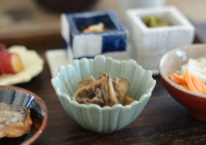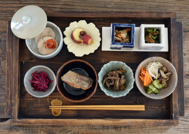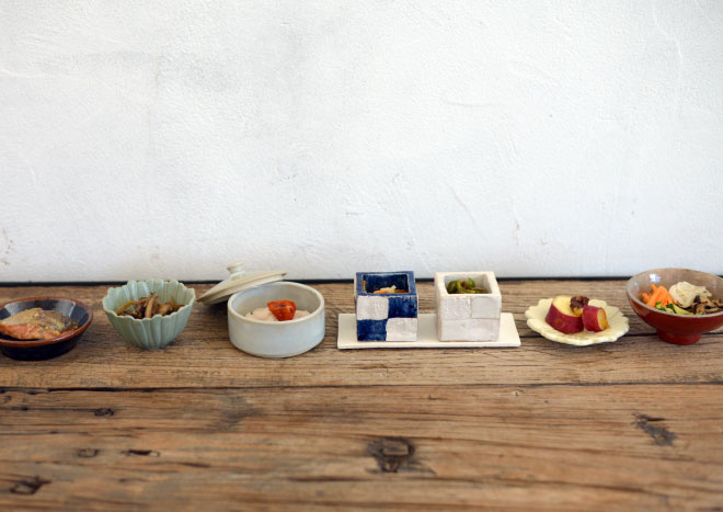 常備菜をそれぞれ小鉢や小皿に盛るだけで