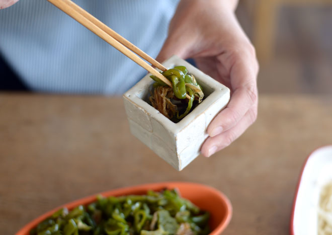 ピーマンのおかか醤油はお気に入りの白い角小付に。