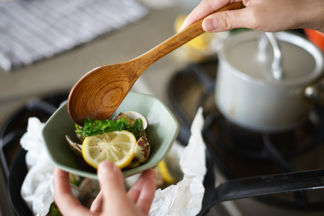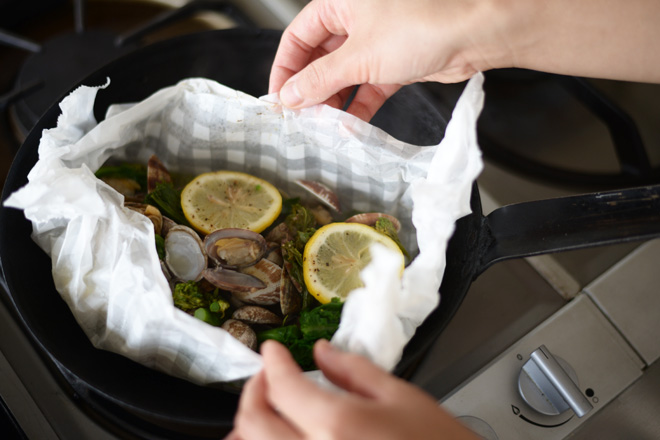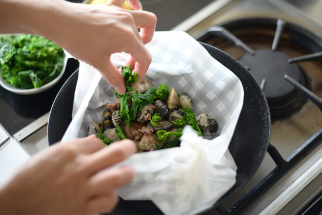 あさりと菜の花のカルトッチョ。