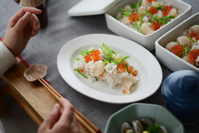 今日はお重を使うから、落ち着いた雰囲気で相性も良さそう。