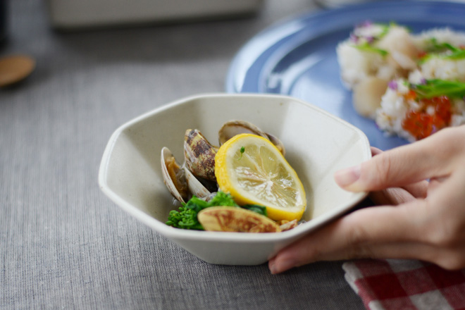 つやのあるミント色の深皿が春っぽくてかわいいな。