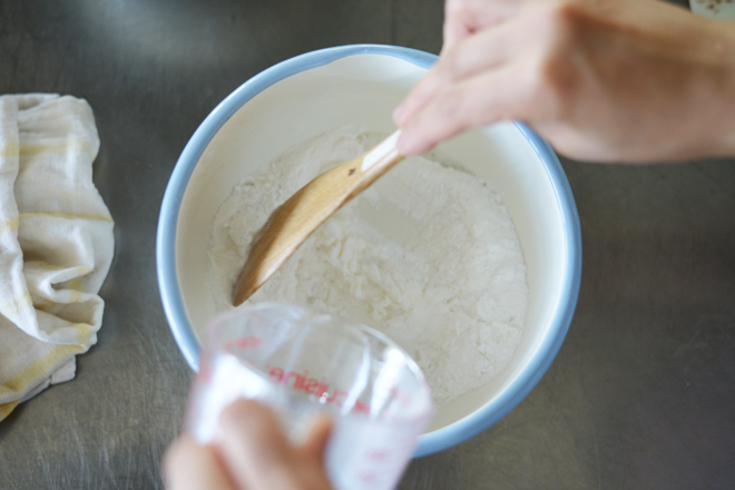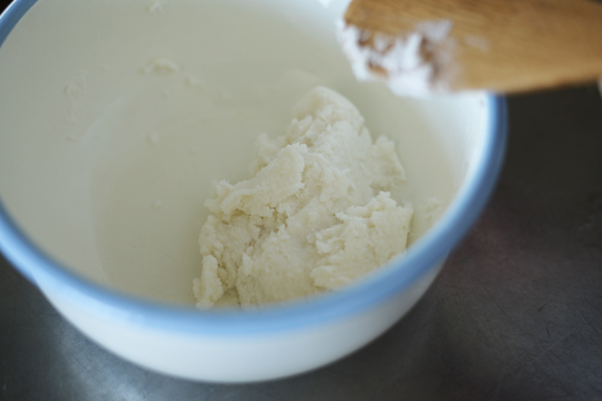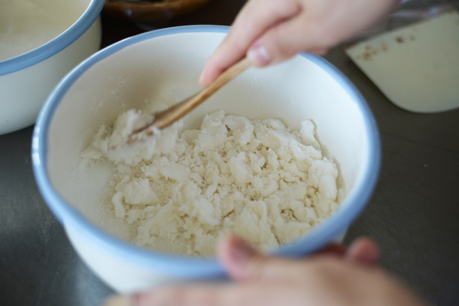 まずは上新粉と砂糖をボールに入れてからお湯を入れまとめていく。