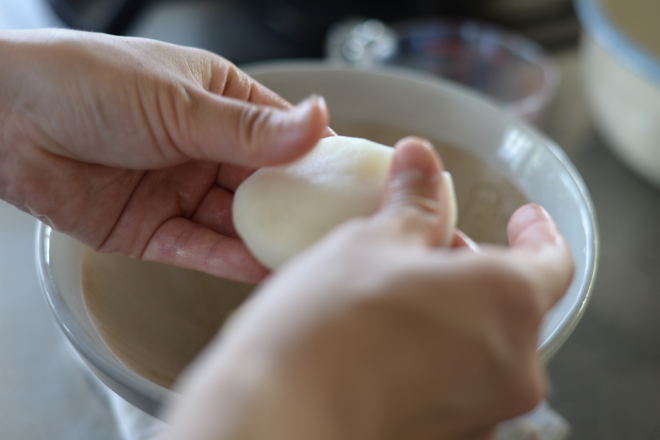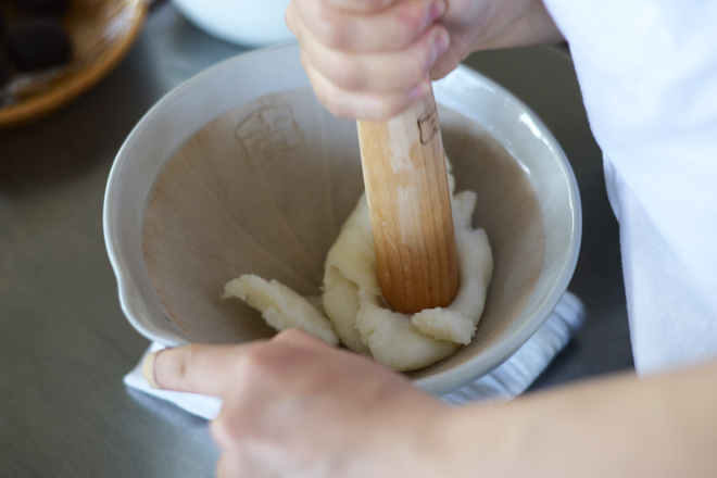 蒸し上がったらモルティエに入れて、ペッタンペッタン餅つきのようにこねていきます。