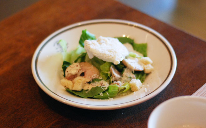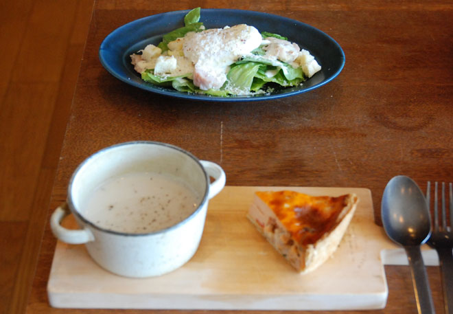 今日の料理はキッシュと鶏ハムとポーチドエッグのシーザーサラダ。
