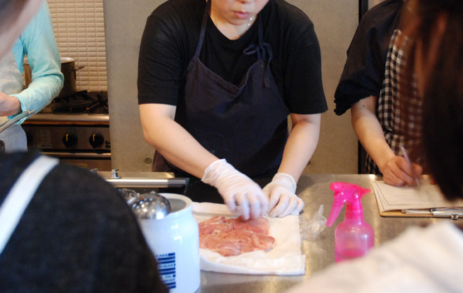 キッシュを作り終わったらサラダの鶏ハムの説明。