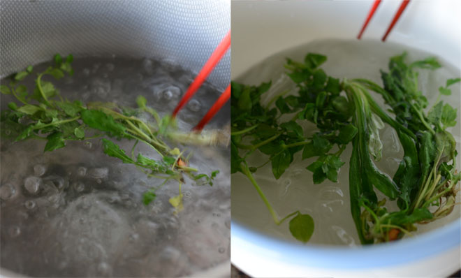 芹や薺など残りの葉ものの七草は、軽く茹がいて直ぐ氷水にいれ色止めします。