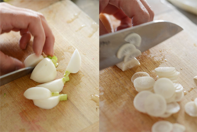 菘と蘿蔔は食べやすい大きさに切って下茹でします。おかゆと食べて違和感がないくらい少し柔らかめに茹でます。