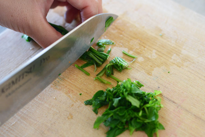 冷めたら、軽くしぼって粗く刻みます。刻んだものは再度水を軽くしぼっておきます。