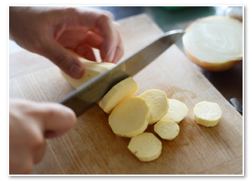 旬のさつまいもと玉ねぎで初めての料理、すり流しを作ってみよう。