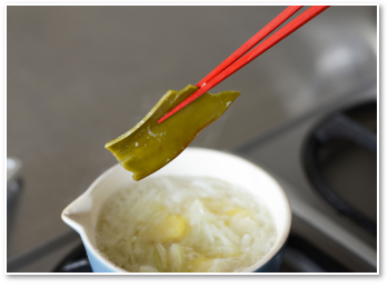 沸騰する直前に、昆布をとりだす。